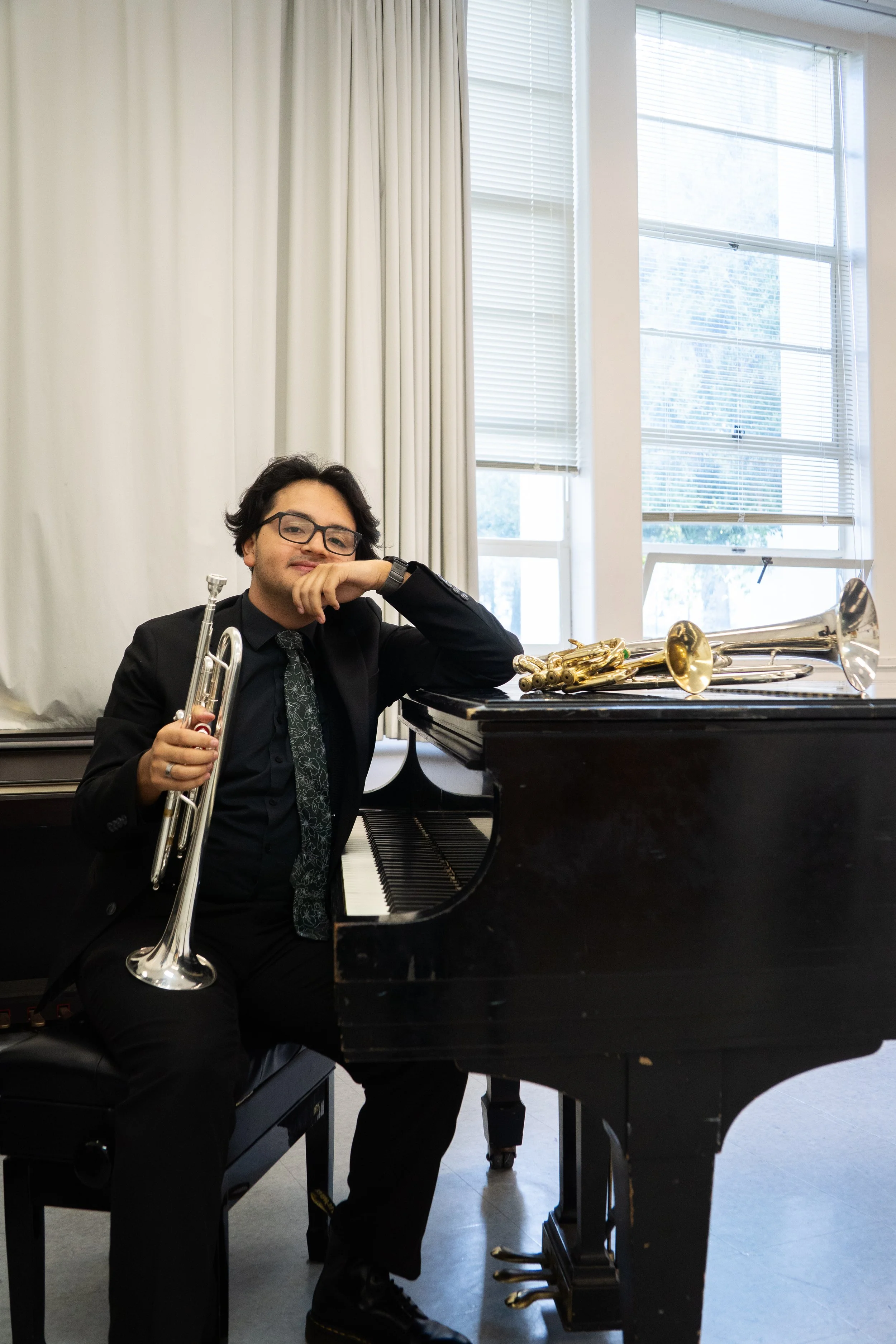 Working closely with our other trumpet players and writing behind the scenes, Hector is our second trumpet player, specializing in Jazz, Improvisation, Wind Band, and Classical music, especially as it relates to Flugelhorn.